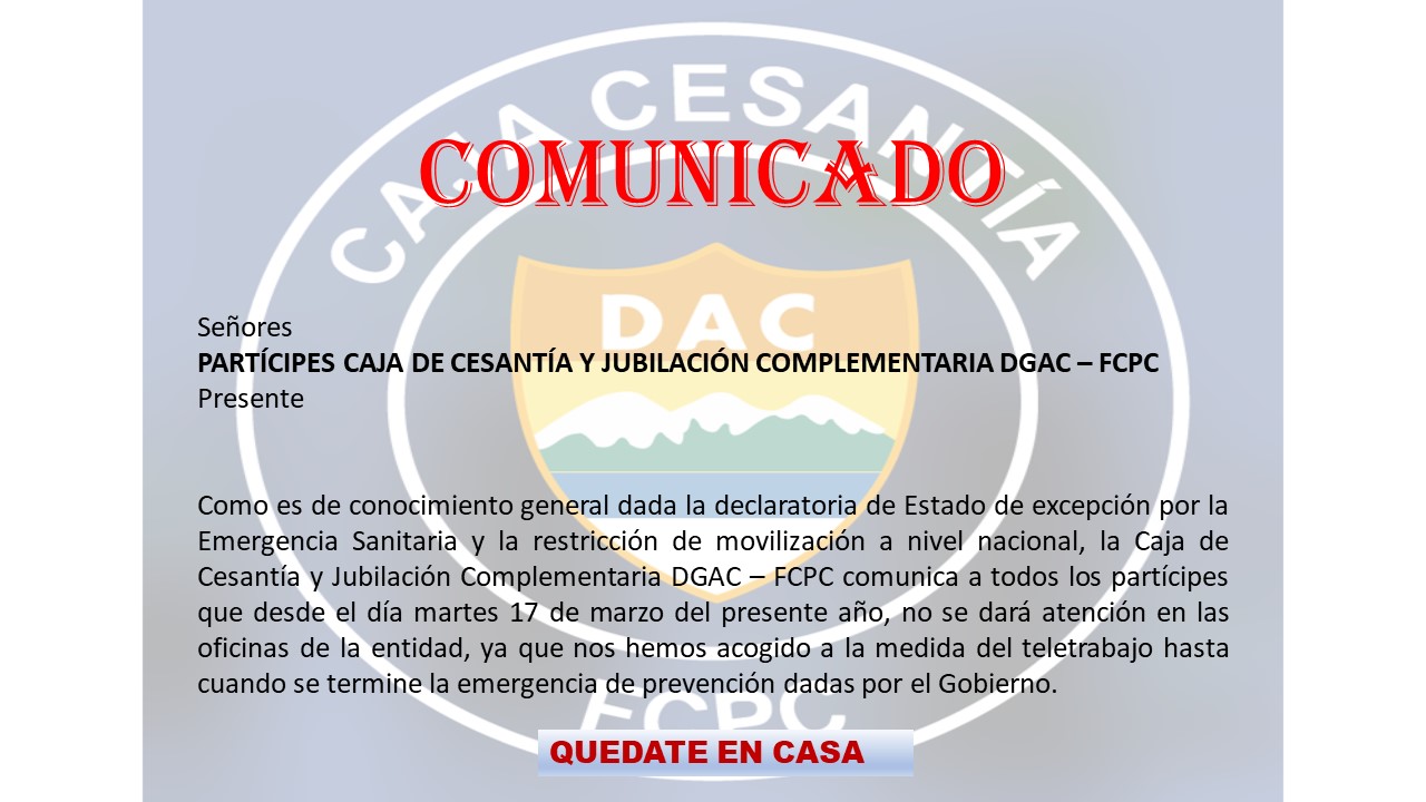 Como es de conocimiento general dada la declaratoria de Estado de excepción por la Emergencia Sanitaria y la restricción de movilización a nivel nacional, la Caja de Cesantía y Jubilación Complementaria DGAC – FCPC comunica a todos los partícipes que desde el día martes 17 de marzo del presente año, no se dará atención en las oficinas de la entidad, ya que nos hemos acogido a la medida del teletrabajo hasta cuando se termine la emergencia de prevención dadas por el Gobierno.